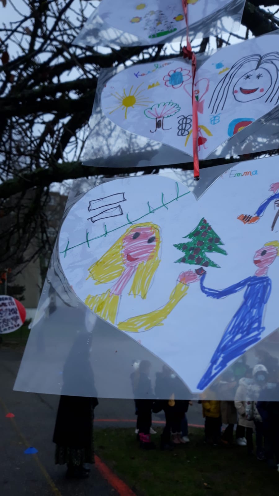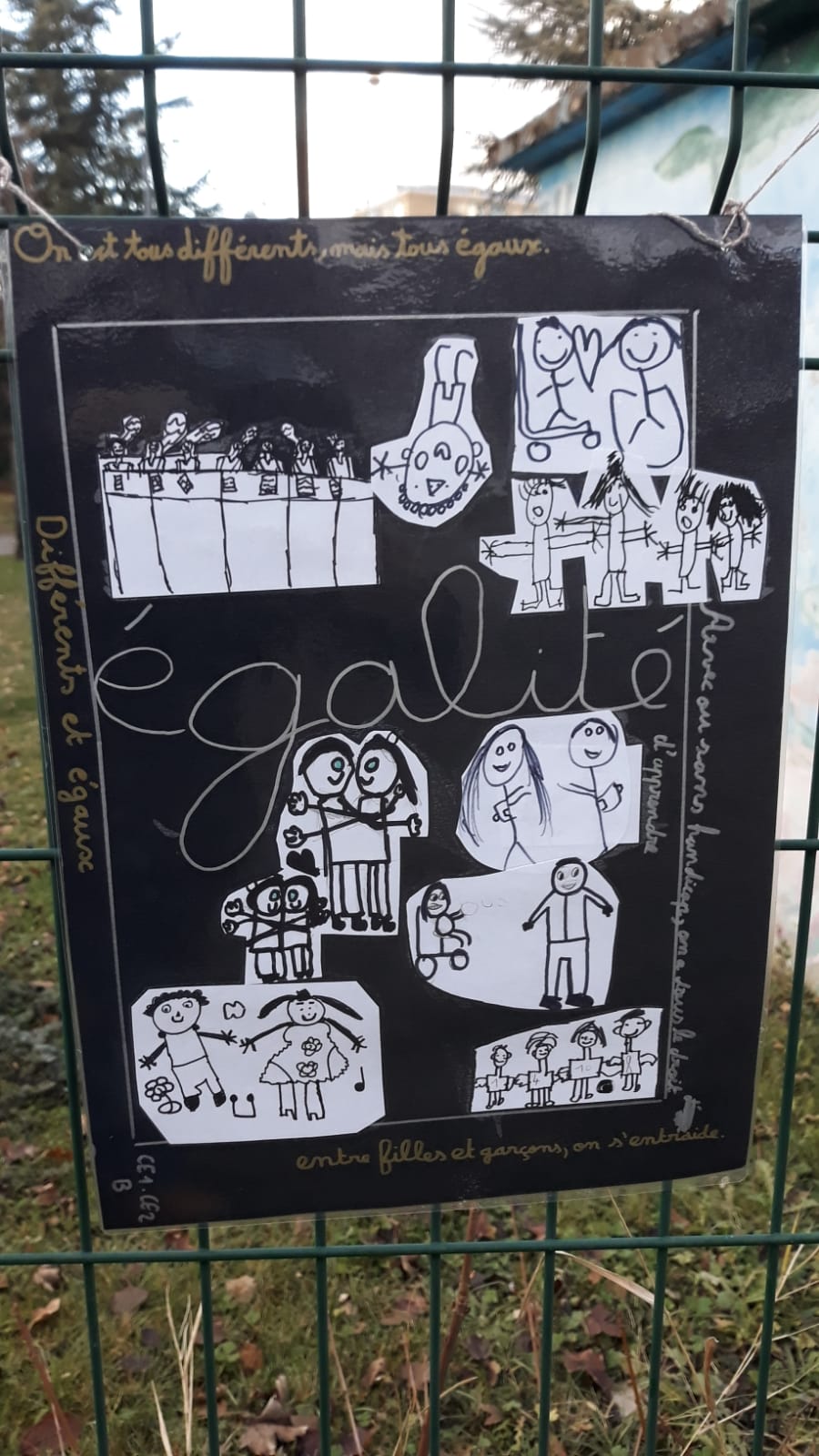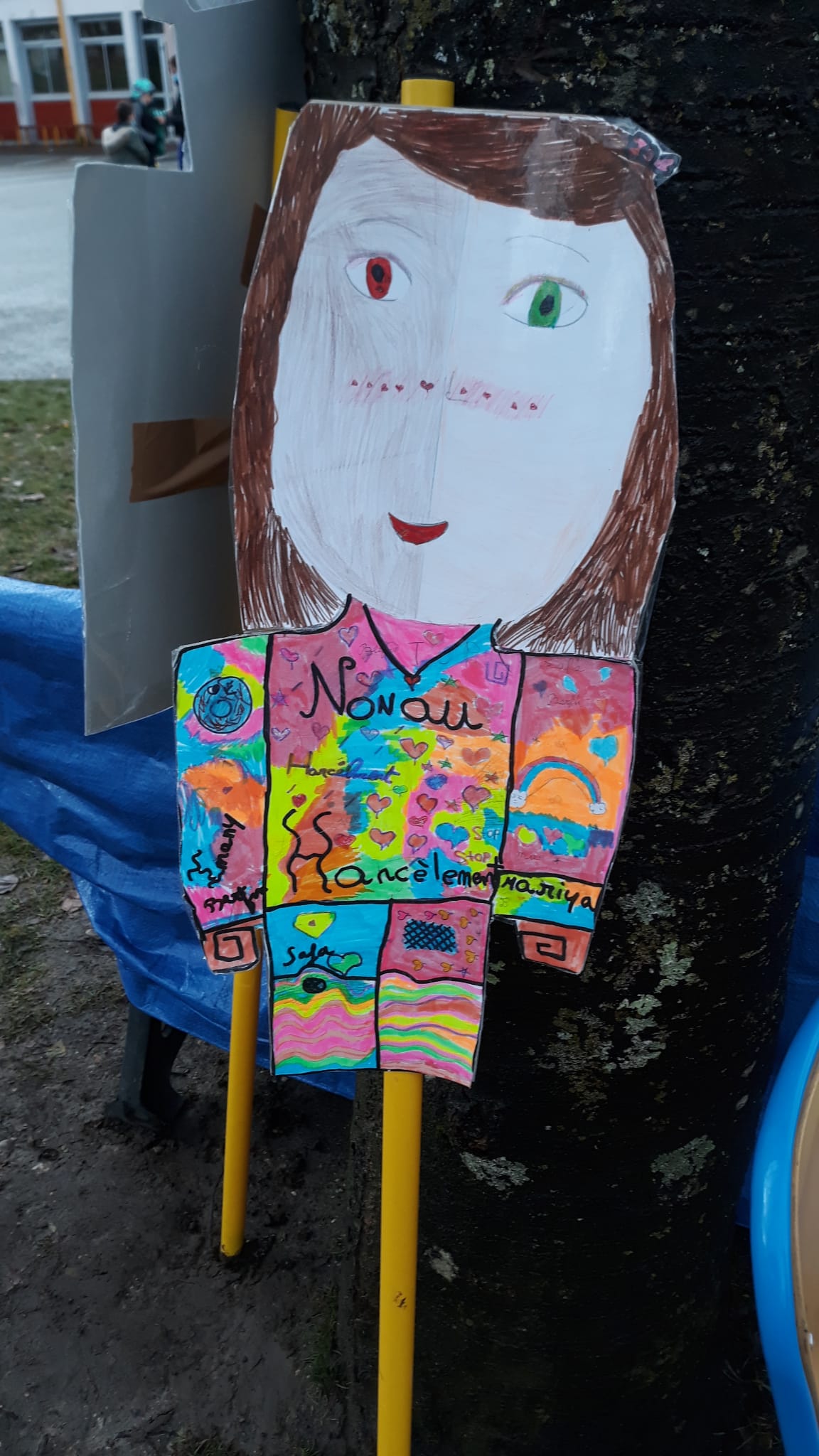 Les productions étant plastifiées ou vernis, elles resteront au moins jusqu'aux vacances dans la cour, permettant ainsi aux parents qui n'ont pu venir aujourd'hui de prendre connaissance du travail réalisé.
